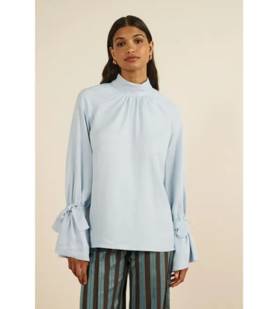 The Bosco Shirt in light blue offers a refined silhouette with its high neck and flared sleeves finished with delicate ties at the wrists. Crafted for a loose, flowy fit, this blouse combines elegance with comfort, making it an ideal choice for a polished yet relaxed look.