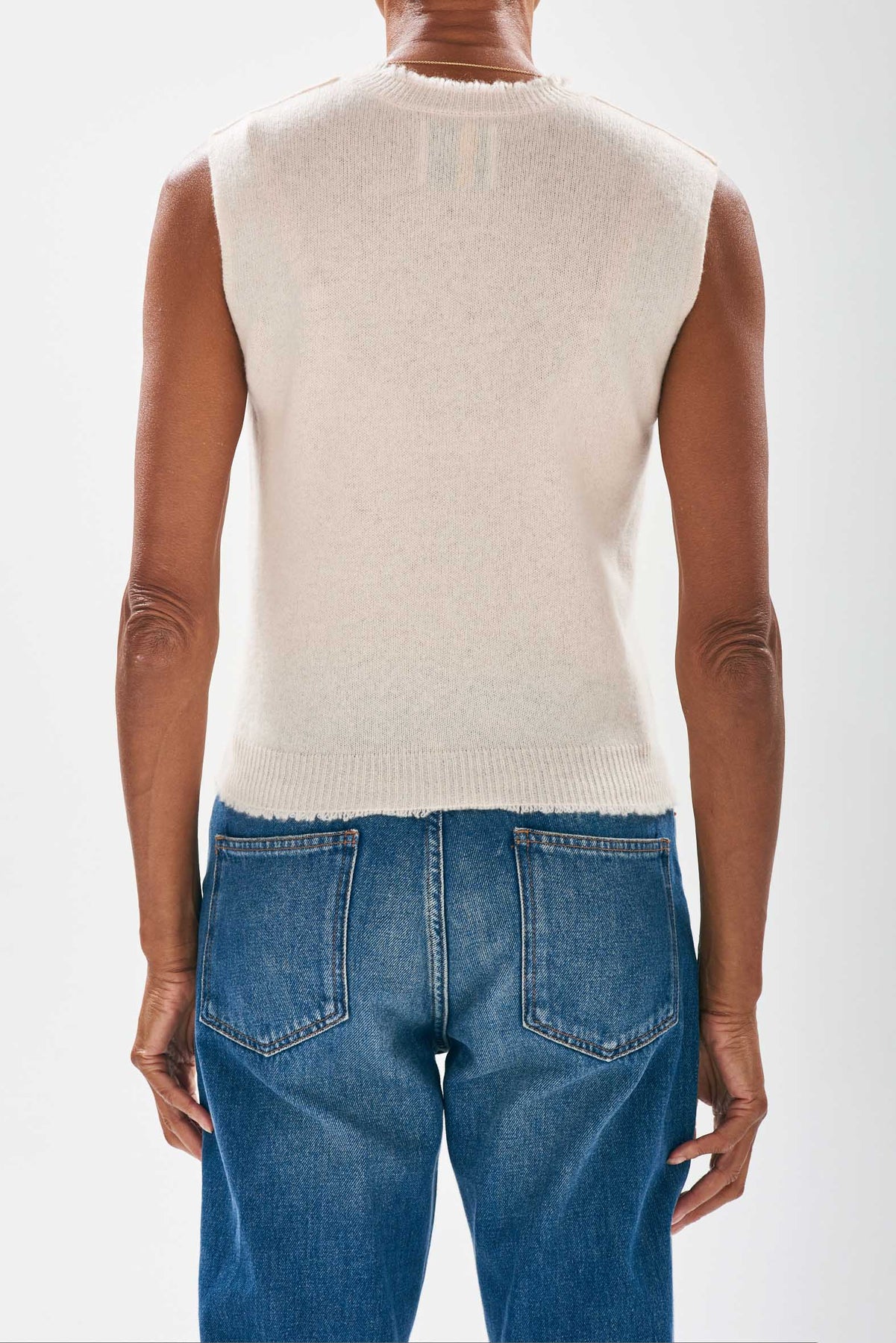The Jumper 1234 Cashmere Distressed Tank is cut with a crew neckline and a sleeveless ‘tank’ silhouette. Featuring distressed ribs to the neckline and hem, this piece will be a great addition to your transitional wardrobe worn alone or over tees and shirts for a more preppy look. Perfect with denim or a tailored trousers.