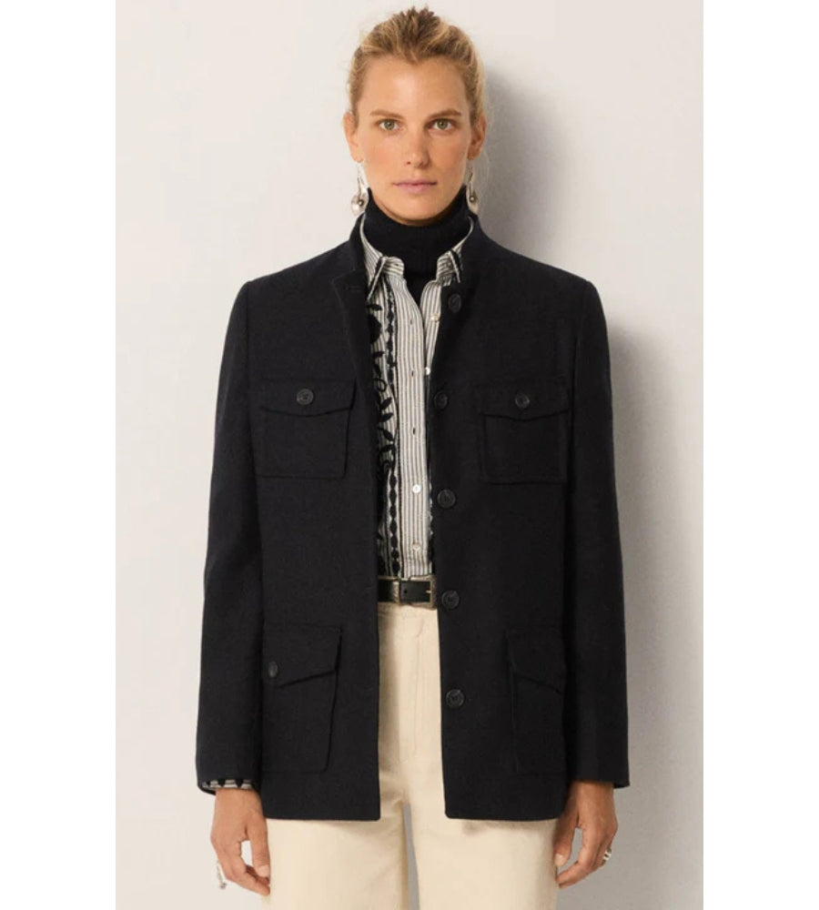 The Lucien Jacket in Marine Army blends sturdy wool with a sleek, functional design for a look that’s both practical and polished. Featuring front flap pockets and clean seams, it combines effortless utility with timeless sophistication. Its rich army shade adds depth, making it a versatile piece perfect for transitioning through seasons with a touch of girly charm.