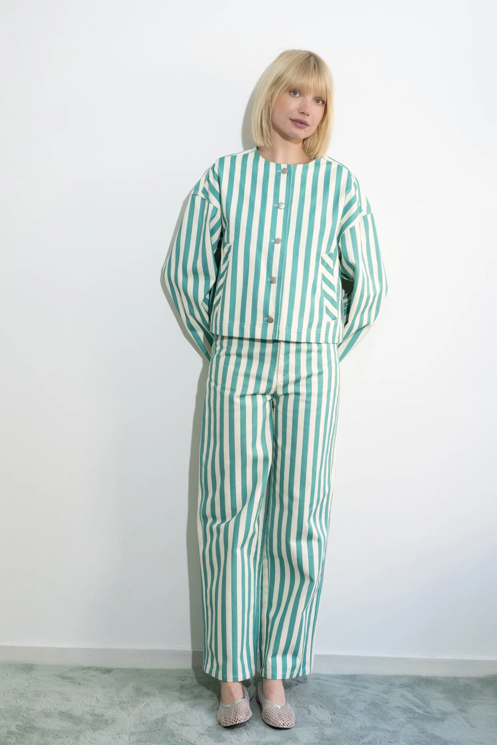 It doesn't get more fun than these emerald striped jeans from The Tiny Big Sister! High waist with wide and elongated legs, these vibrant jeans feature a zip fly and a 5 pocket design. Made from a heavy cotton twill, these striped jeans are comfortable and great alternative to your usual denim, add some fun to your wardrobe!