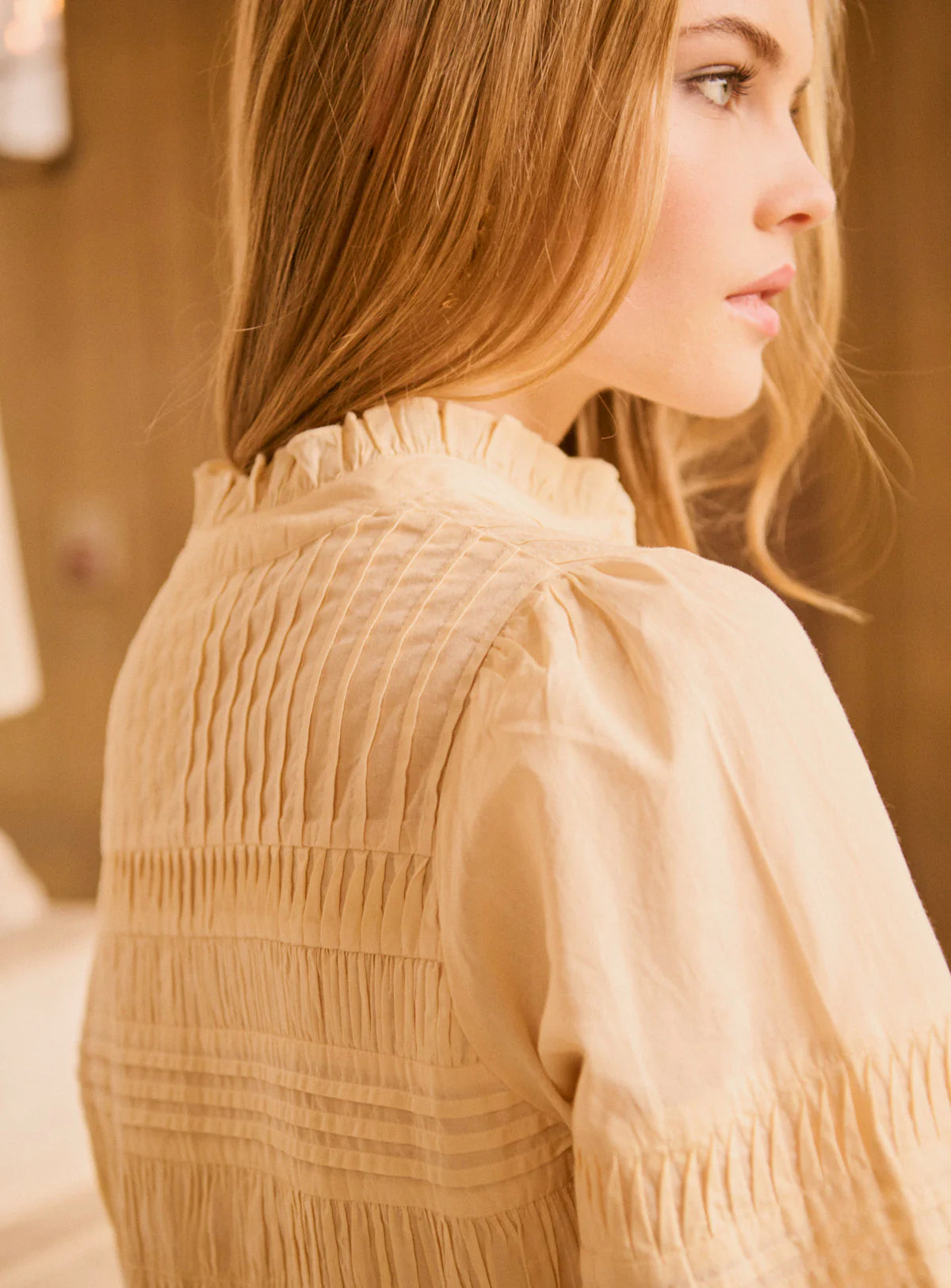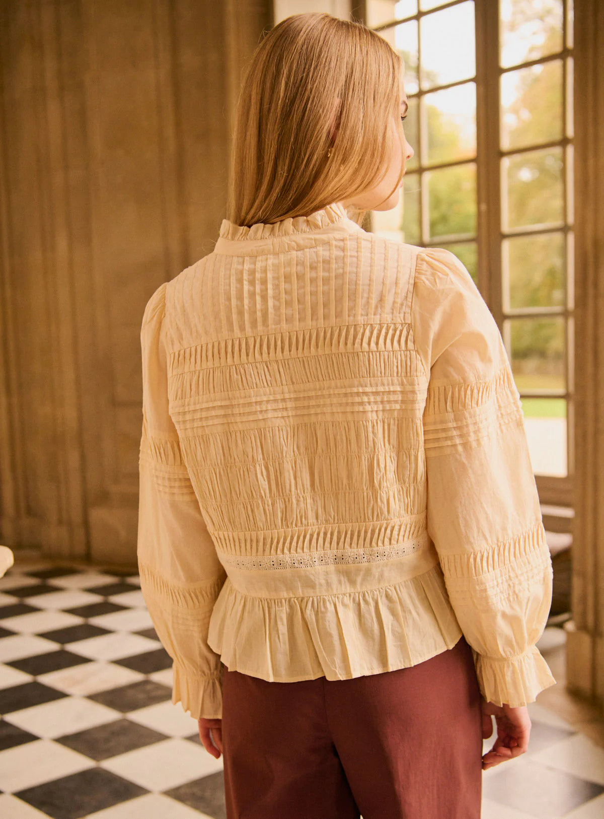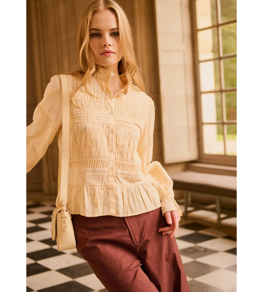 We have fallen head over heels for the Melanie Top. A straight-cut blouse with elegant yellow embroidery details and pleated accents. Features a high, gathered round neckline and long sleeves. The hem is finished with a subtle ruffle for a refined silhouette. Perfect for taking you from day to night.