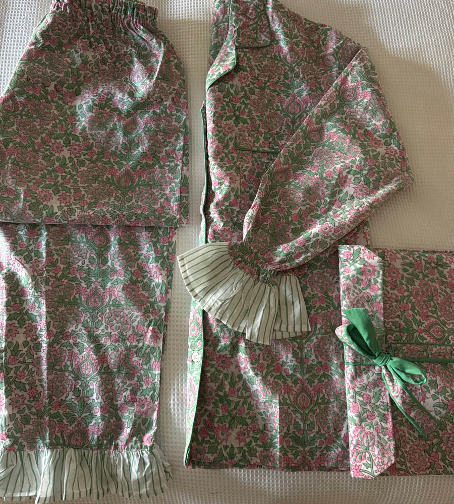 The perfect little matching PJ set, our Coco Long Pyjamas are oh so charming and comfortable. Available in three fun & fabulous block print designs and featuring our own little finishing touches with a pretty detail here and there. The button up top has long sleeves with elasticated cuffs finished off with a pretty frill. Bright piping around the edges adds a pop of colour. The long pyjama bottoms are finished with a frill at the ankle and feature a comfy elasticated waistband. The Coco bottoms also feature a tassel on the end of the tie which can be worn loose or in a bow. Each set is then all wrapped up in its own gorgeous pouch made in the same cotton. The perfect special pressie for a loved one or for yourself! We will be wearing ours with sandals on a hot summers day around town or on holiday, they seem just too good to save just for lounging at home.