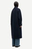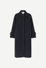 We have found the perfect navy long wool coat! The Alma by Samsoe Samsoe is a relaxed fit with a round neckline and collar. Featuring raglan sleeves, button fastening centre front, cuff straps and vertical front welt pockets. Perfect for elevating any look this season. This coat does size up big therefore we recommend sizing down (model is wearing a small).