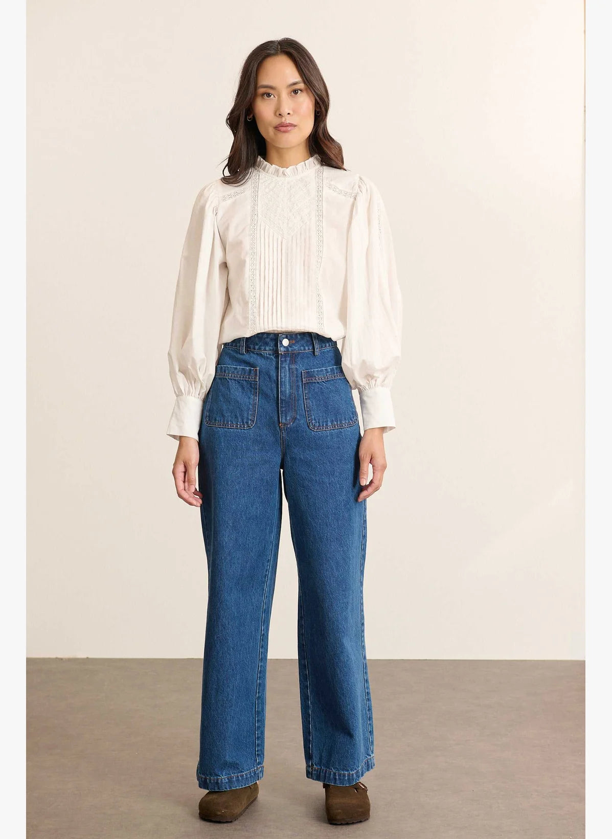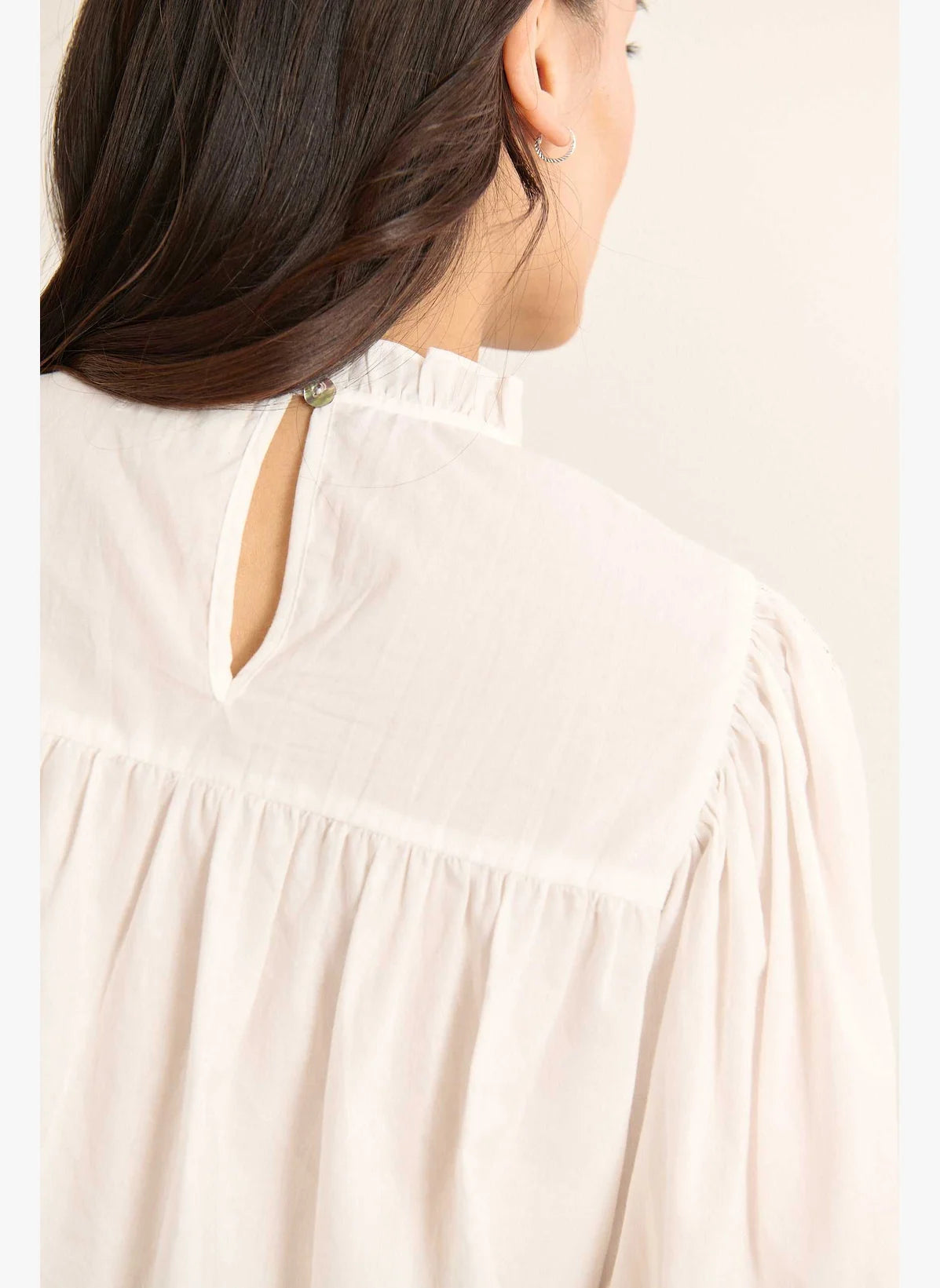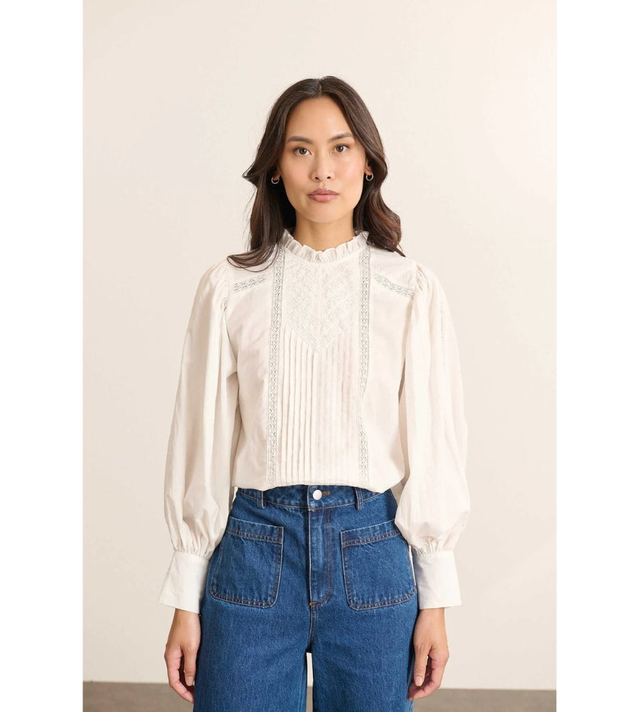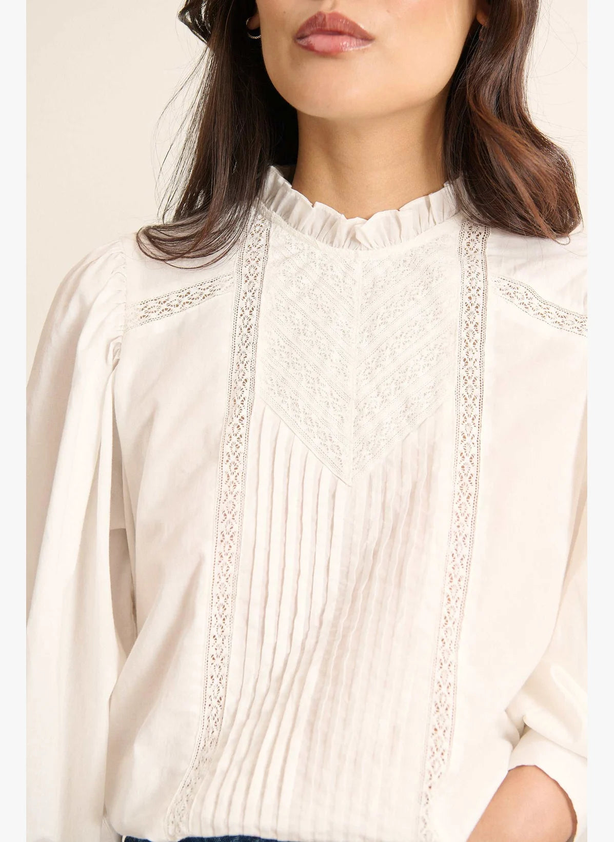 Introducing the Bella, a charming white blouse that effortlessly blends elegance with playful femininity. This piece features long buttoned sleeves and a relaxed, straight silhouette that flatters every frame. The round neckline is adorned with delicate ruffles, while strategic cutouts showcase intricate lace and pleats for added visual interest. A discreet back button closure completes the design, making it as practical as it is pretty. Perfect for elevating your everyday wardrobe.