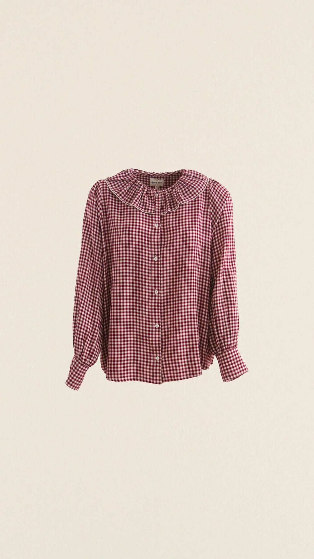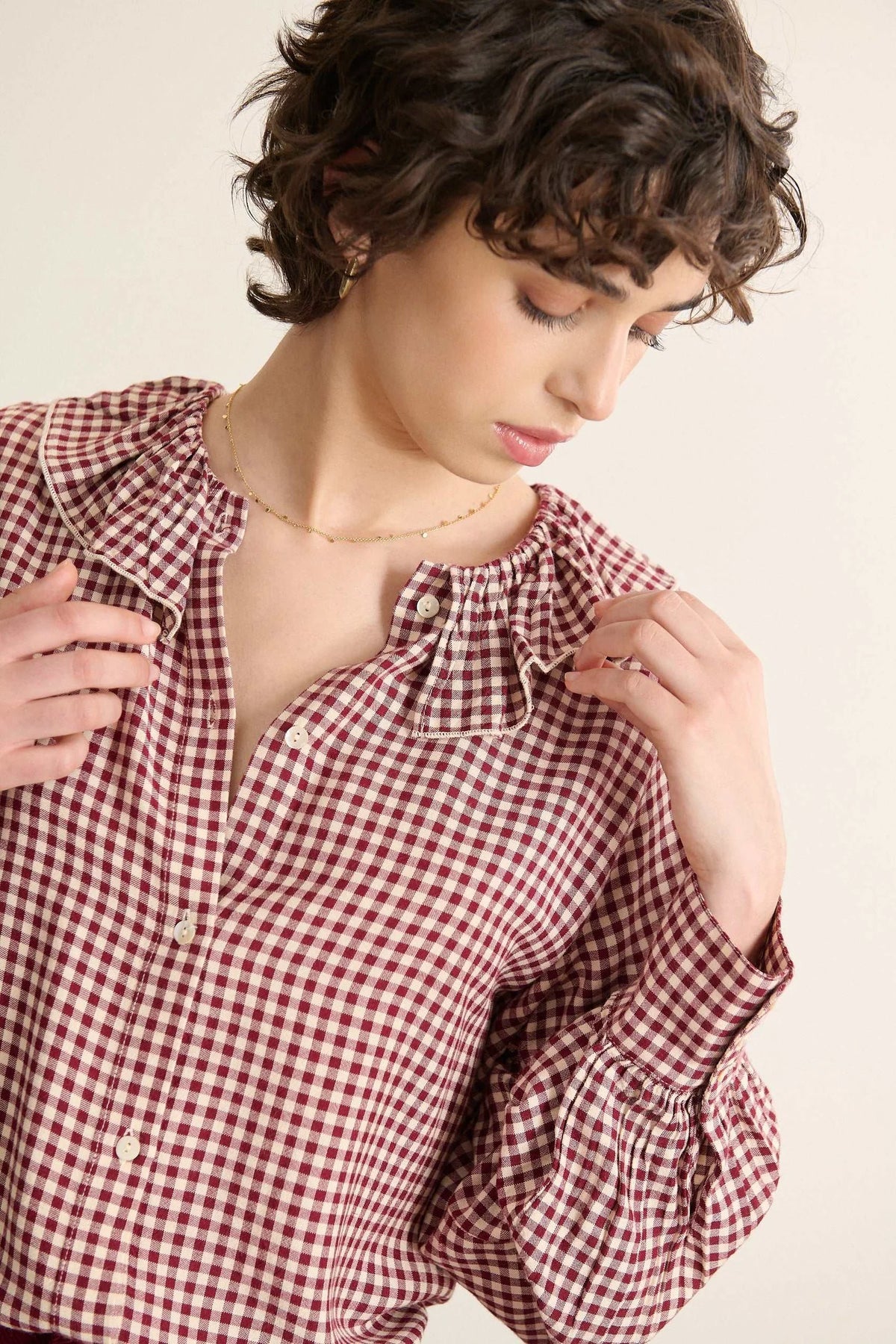 Berille, a pretty everyday blouse by French brand Garance. Featuring a little frill collar, long balloon sleeves and crafted from a super soft cotton in a burgundy check, the colour of the season! A relaxed shape for a cool effortless look. Model wears a Small.